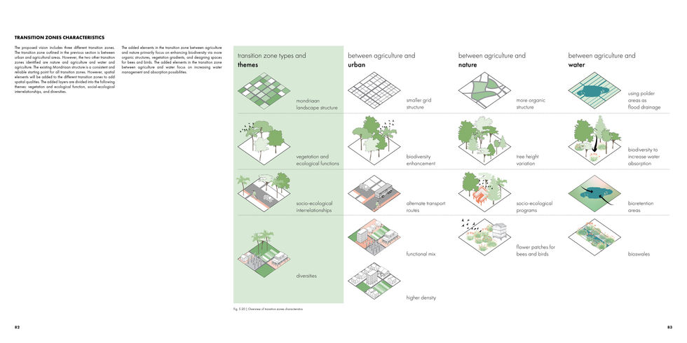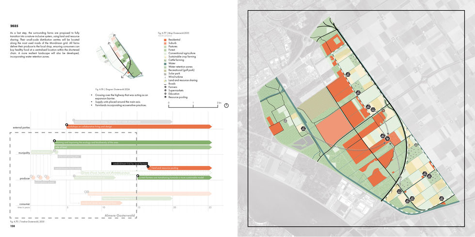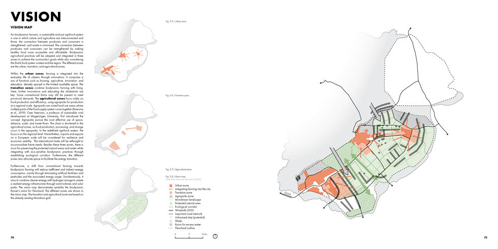 Through spatial mapping and critical analysis of the supply chain and consumer behaviour, the identified opportunities and challenges are translated into a spatial vision for our transition community, i.e. the biodynamic farmers, through three zones: urban, transition, and agricultural, each supporting varying producer-consumer dynamics and shortening the chain while integrating farming, biodiversity, innovation, and renewable energy for a multifunctional and interconnected landscape. The project further delves into the existing policies and identifies synergies, conflicts, and internal dilemmas within the proposed spatial vision. The project developed scenarios to understand the exemplary measures to address the internal dilemmas and upscale the biodynamic farms in Flevoland. These measures are further translated into interconnected strategic actions predominantly as physical spatial interventions and policies to regulate market dynamics and facilitate the energy transition. All of these are supported by collaborations between stakeholders with varying vested interests and raising their awareness through educational reforms. The different zones and types of transition zones are key to implementing this vision. They are reflected at multiple scales, ranging from Flevoland at a regional level to a neighbourhood-scale pioneering pilot project in Oosterwold.